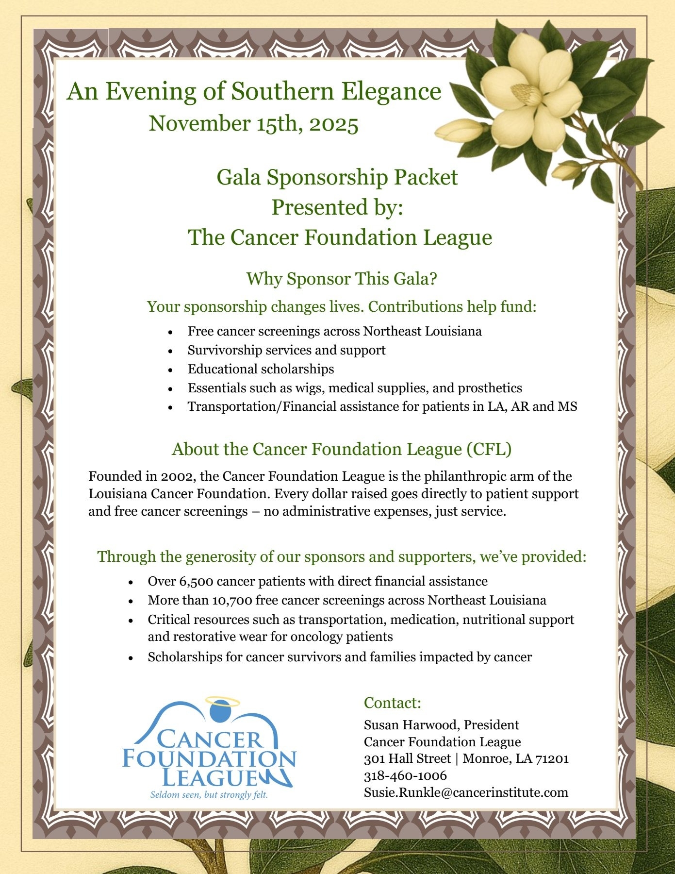 We hope you will join us November 15, 2025! All proceeds benefit cancer patients in northeast Louisiana.